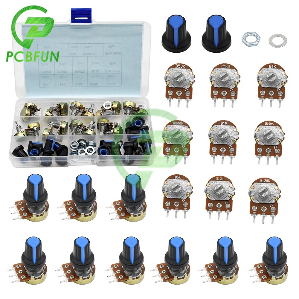 WH148 Potentiometer Kit B1K 2K 5K 10K 20K 50K 100K 500K 1M 15mm Linear Taper Rotary Potentiometer Resistor Set 3pin with cap