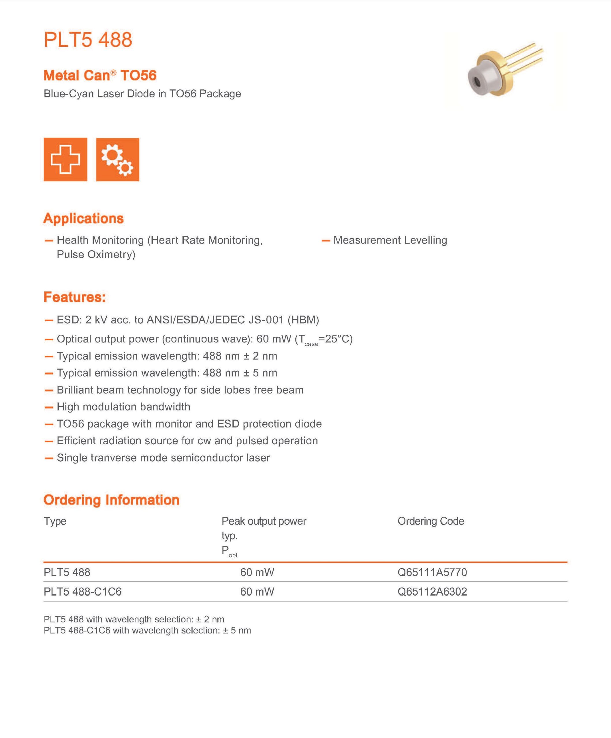 • 0sram PLT5 488 Blue-Cyan TO56 5.6mm 488nm 60mW Laser Diode (Single Mode)