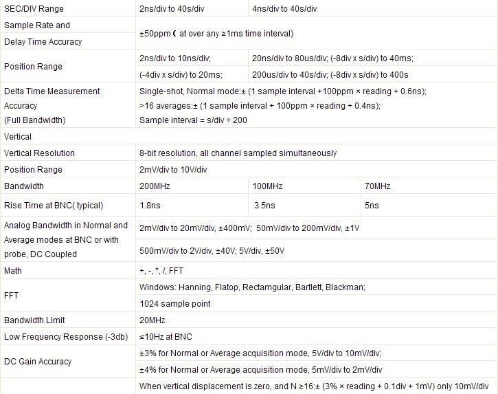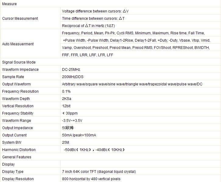 2 Channel Digital Oscilloscope. 1 Channel Arbitrary/Function Waveform Generator. The Keys for osilloscope and waveform generator is seperated for convenient to operate it simultaneously. Oscilloscope: 70MHz Bandwidth, 1GSa/s Sample Rate. 25MHz Arbitrary waveform generator, 12 bits resolution, 200MHz DDS, 7 inch 64K color LCD display, Resolution 800×480.