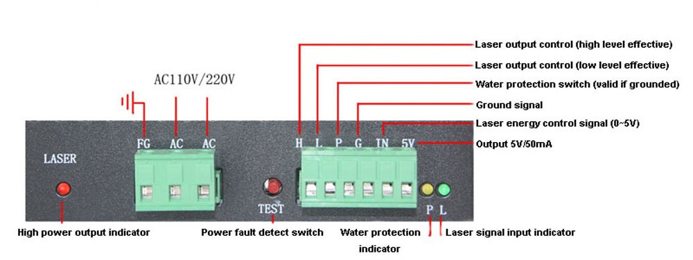 Open power protection in the power supply has these functions: the power supply can work for a short time in the state of open circuit while the case touches the ground well so as to avoid damage to the power supply caused by the laser tube burst.