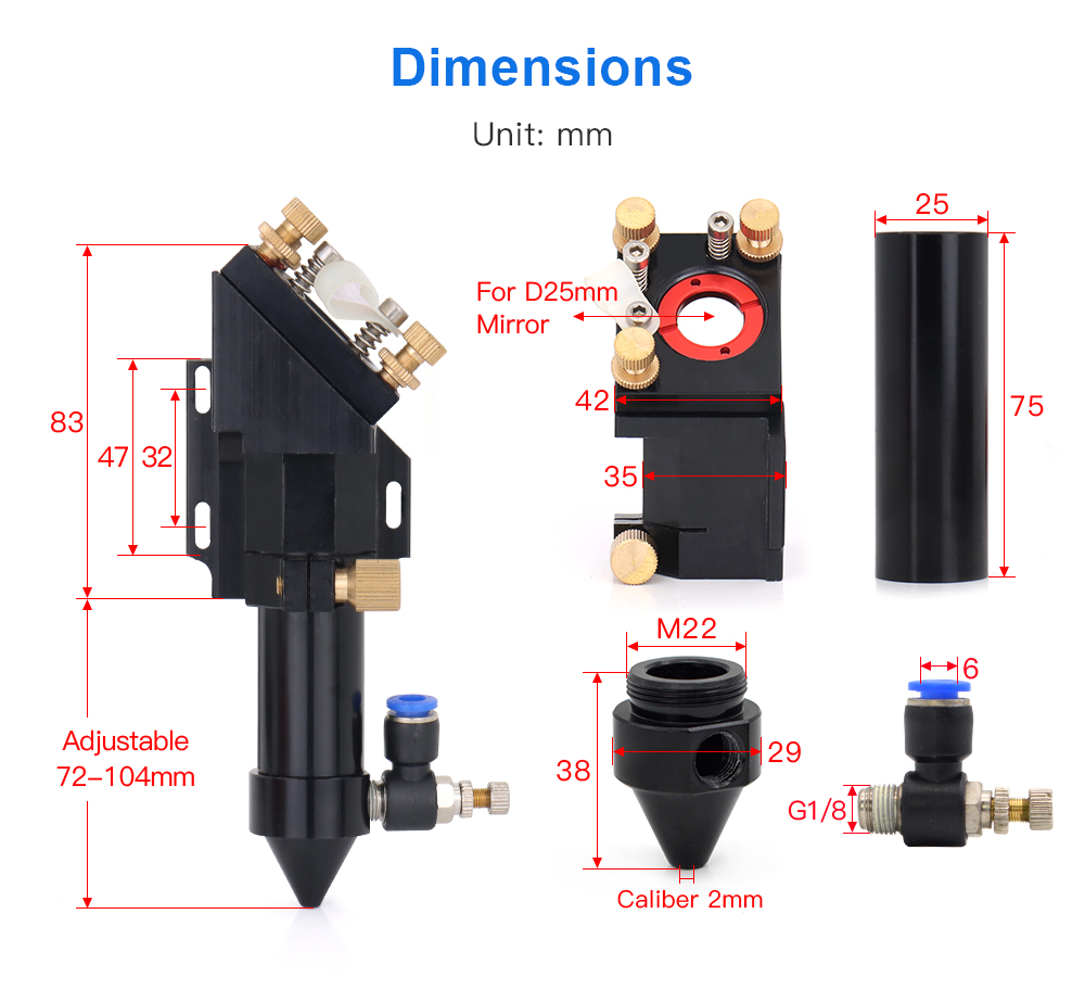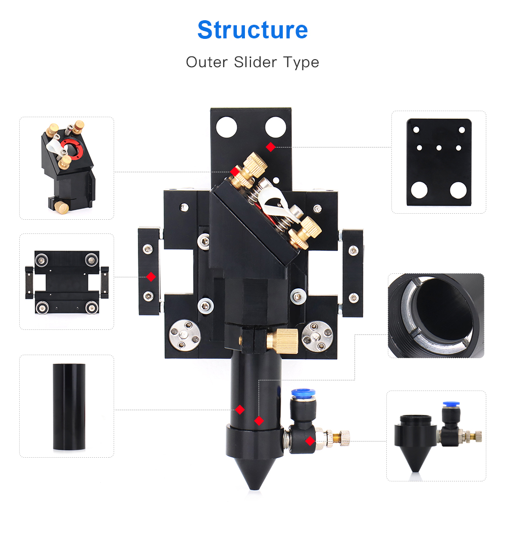 WaveTopSign CO2 Laser Head for Dia.20mm FL 50.8/63.5mm Lens D25mm Mirror Outer Slider Type with Air Nozzle quantity