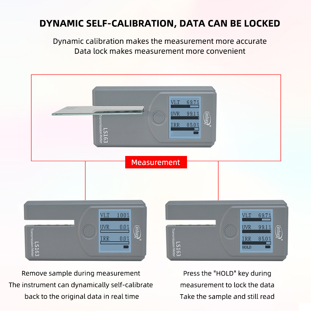 1. Multifunctional solar film tester: can test three parameters of visible light, infrared and ultraviolet. This solar film transmission meter has three different display modes, which are lighttance display, rejection rate display and light transmit transmission display.widely used in solar film, glass industry, automobile 4S shops, beauty shops, etc. It is suitable for display, production, quality inspection, inspection and other occasions. It can test optical properties of solar film, stick-film glass, PC material and window glass.